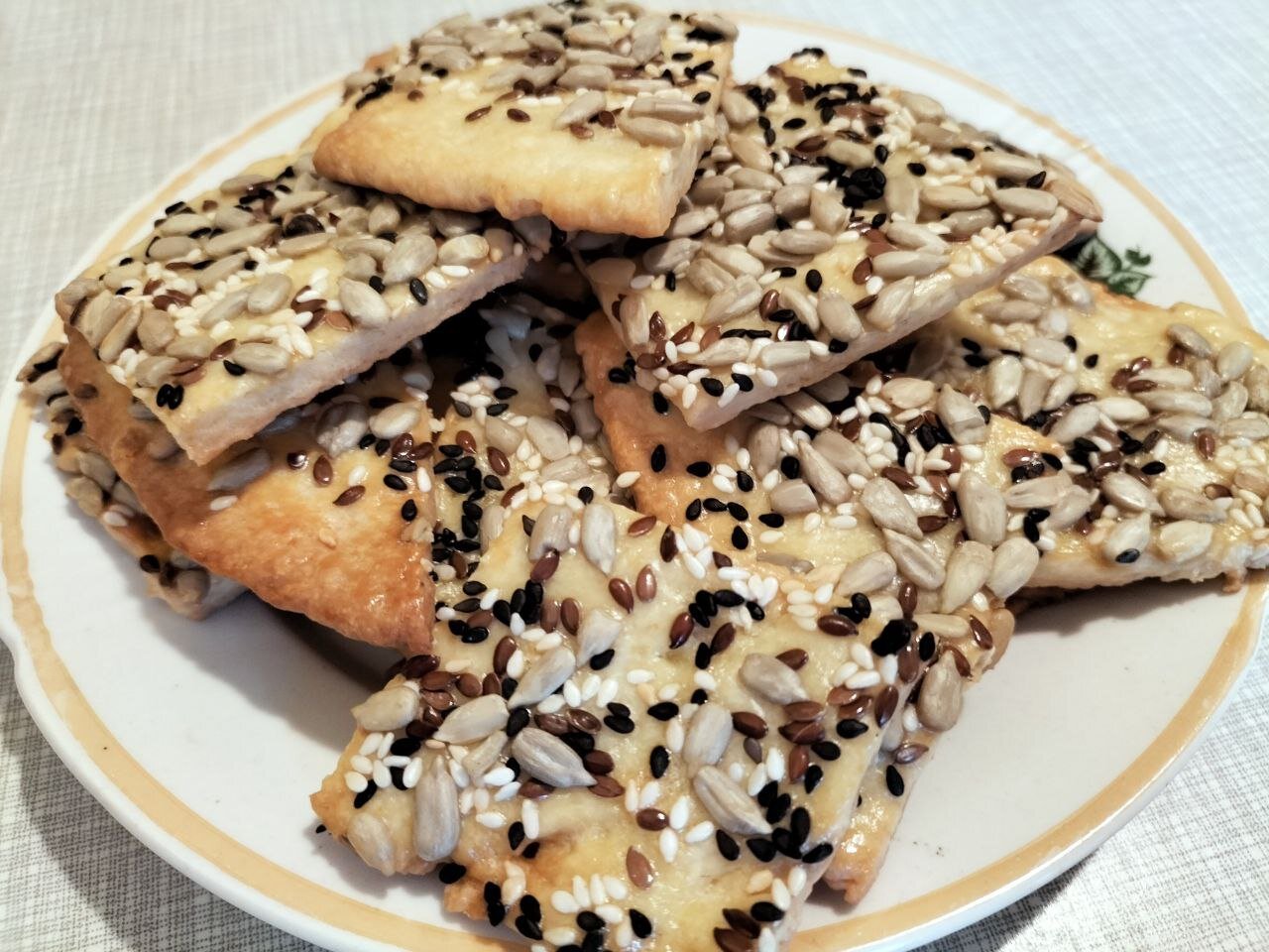 Далее раскатываем тесто в тонкий круг. Посыпаем семечками по вашему вкусу. Слегка прокатываем скалкой. Сверху обмазываем яичной смесью.
