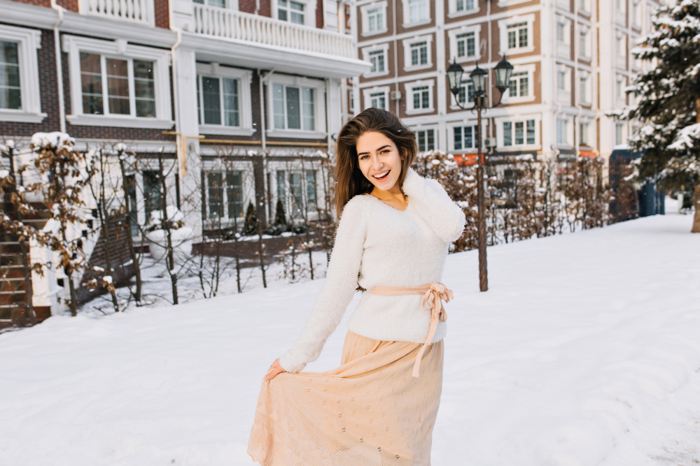 Тот же длинный пуховик можно отлично стилизовать другими вещами, надев под него лаконичный свитер и юбку длины миди. А на ноги — акцентные сапожки на каблуке. Ну и всё, осталось подобрать подходящую сумочку и можно идти покорять улицы города. Такой базовый образ подойдёт любой.