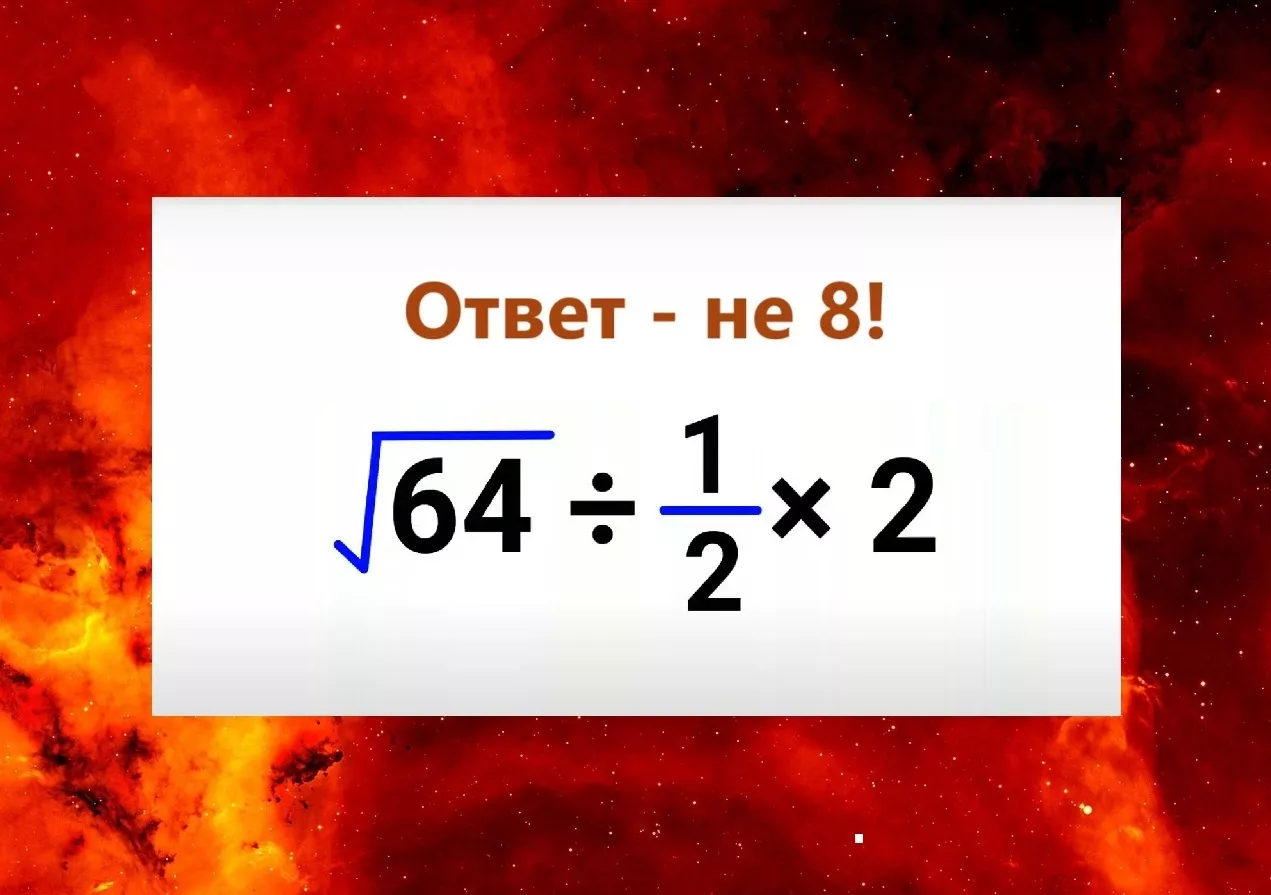 Перед вами выражение, знакомое ещё со школьных лет. На выполнение даётся всего 10 секунд, но именно в нём многие ошибаются, торопясь с ответом. Речь идёт о примере √64 ÷ ½ × 2.
