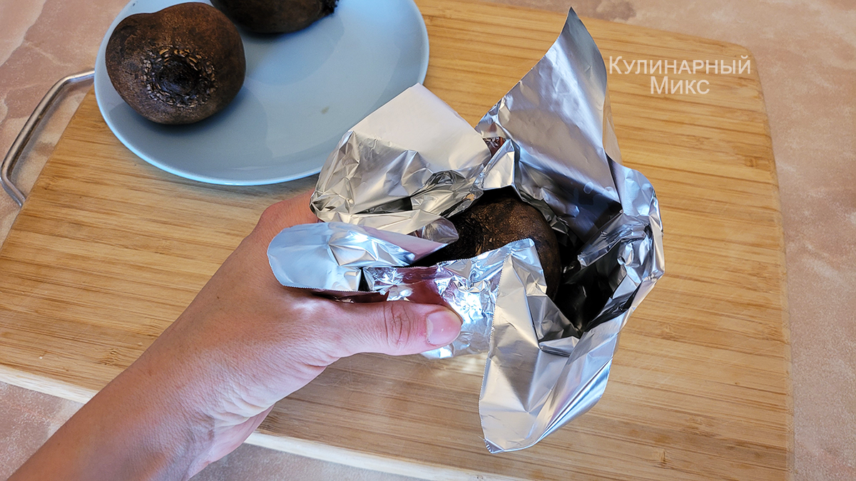 Каждую свёклу моют, кладут на кусочек фольги, слегка смазывают маслом, при желании добавляют соль и специи — базилик или смеси прованских трав. Если свёкла идёт в салат, специи можно не использовать.