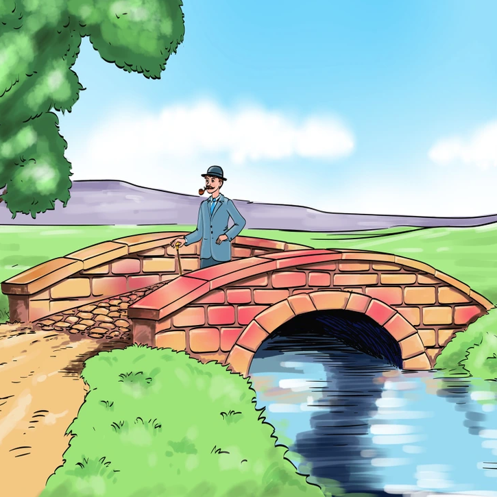 На второй картинке мужчина переходит мост, под которым вроде течёт речка, но почему-то только с одной стороны. Куда же девается вода?