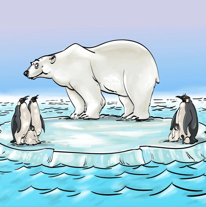 На третьей картинке на одной льдине белый медведь и пингвины. Вот только белый медведь обитает на Северном полюсе, а пингвины на южном.