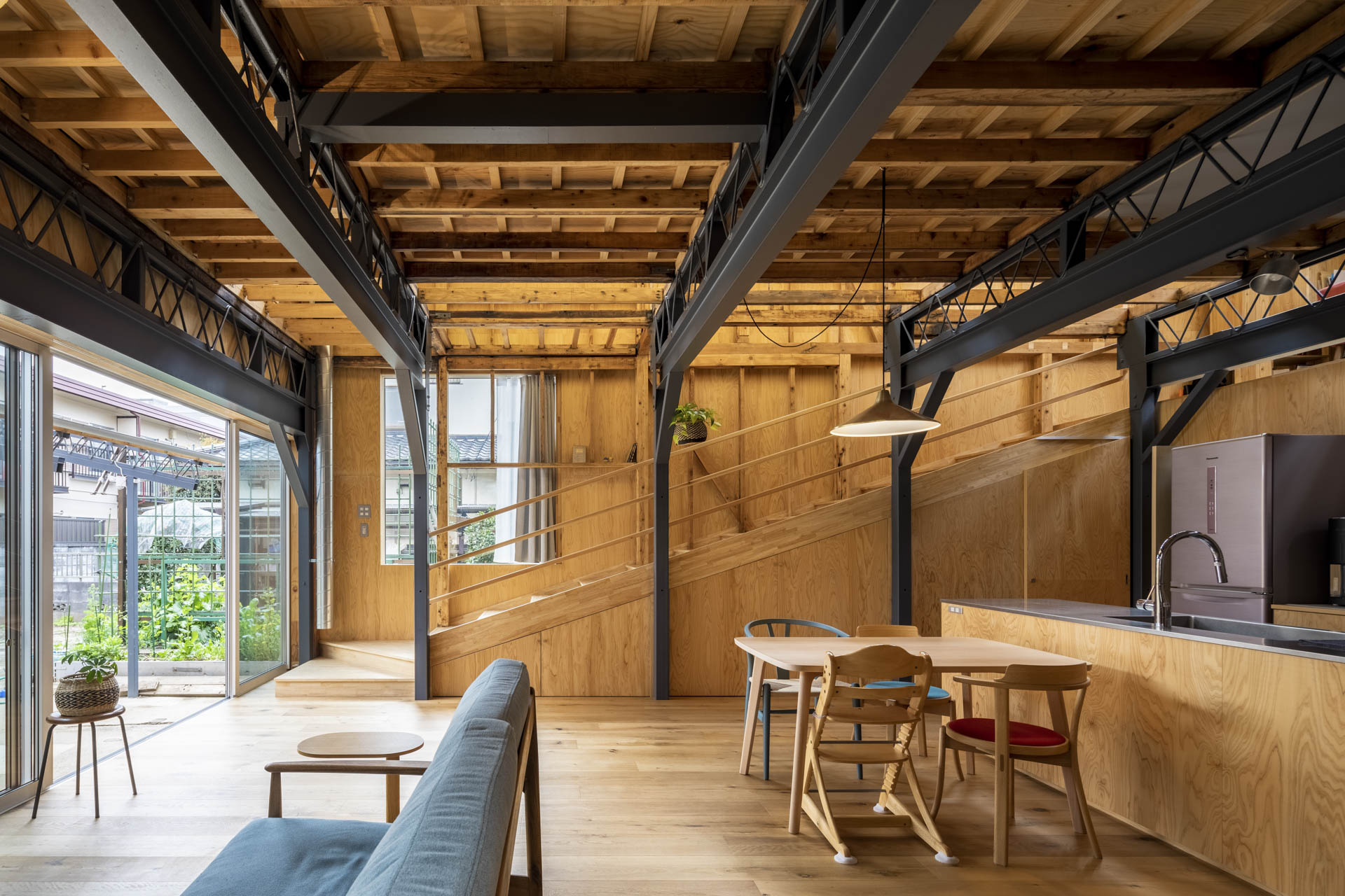 Фасад получил огромные окна, что добавляет глубины деревянному объёму. Само пространство воспринимается как многоуровневая конструкция. Лестничная зона напоминает террасированный сад.