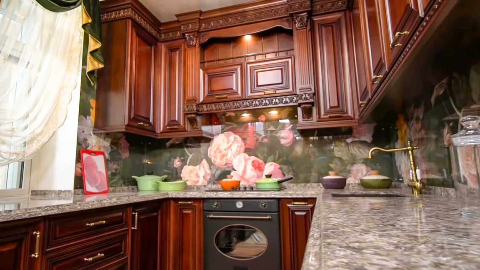 На кухне мебель из натурального дерева, а вот столешница из испанского кварцевого камня. Сама кухня в викторианском стиле.