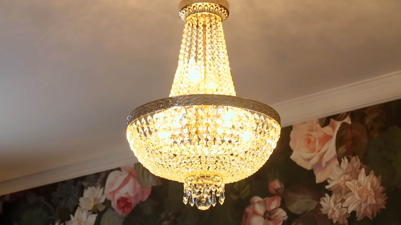 Стены покрыты тёмного цвета обоями с яркими цветами. На потолке красуются большие хрустальные люстры.