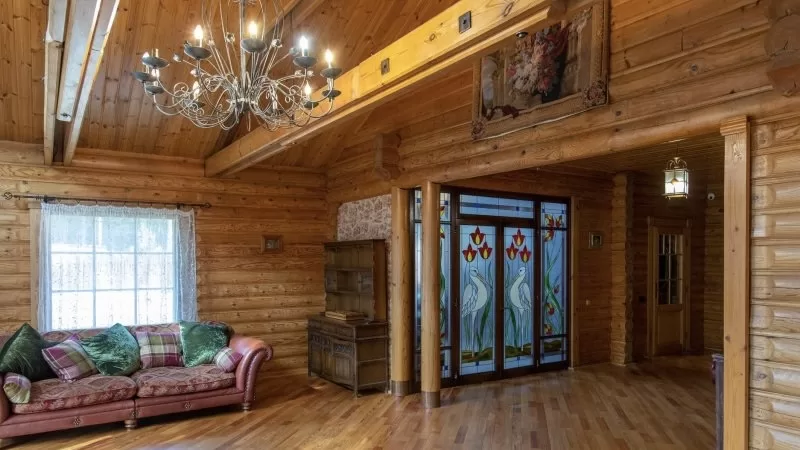 Интерьер дома сочетает традиционный русский дизайн и элементы шале. В доме преобладает мебель из натурального дерева.