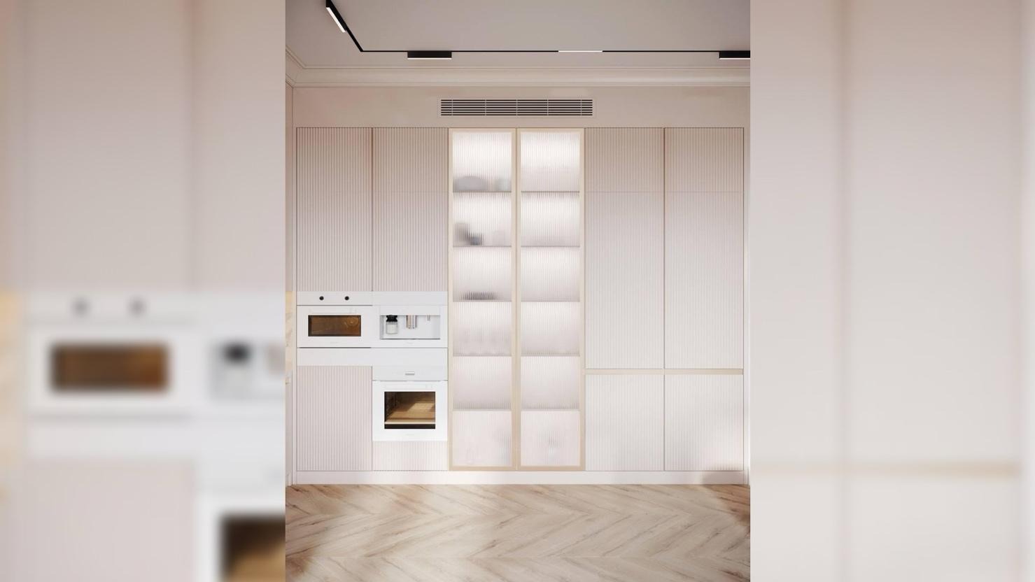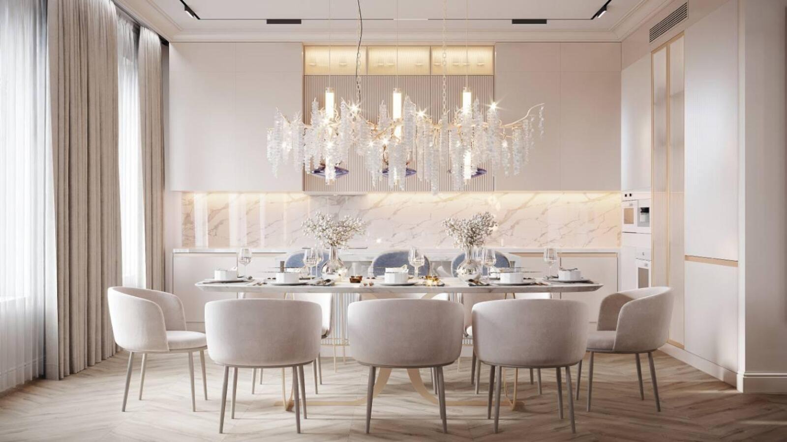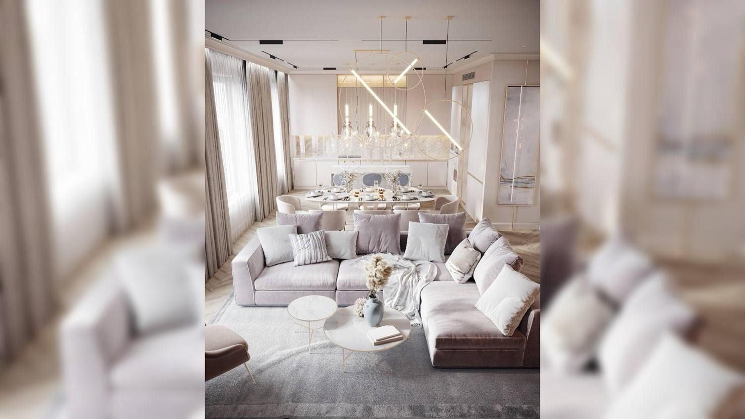 Гостиная, кухня и столовая входят в общую зону квартиры. Пространство открытое, без жёстких границ, рассчитанное на совместную жизнь. Центром стала кухня с островом, вокруг которого собирается вся семья. Интерьер выстроен на спокойной, пудровой палитре без резких контрастов, чтобы дом восстанавливал, а не перегружал.