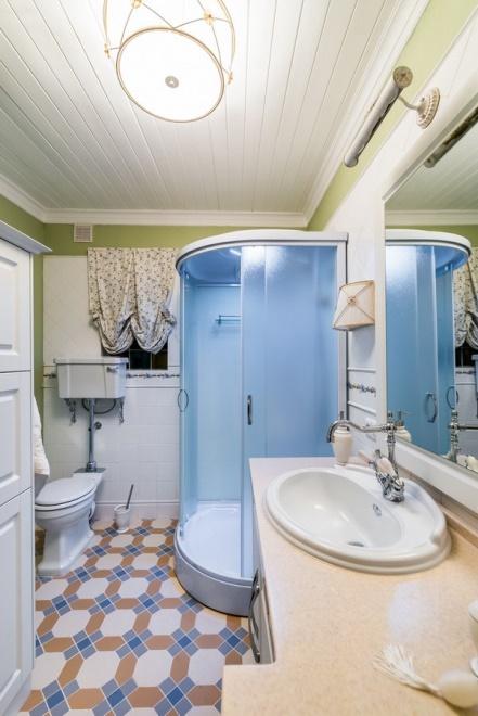 Оригинальная керамическая плитка и в ванной комнате. Интересно смотрится и светильник.