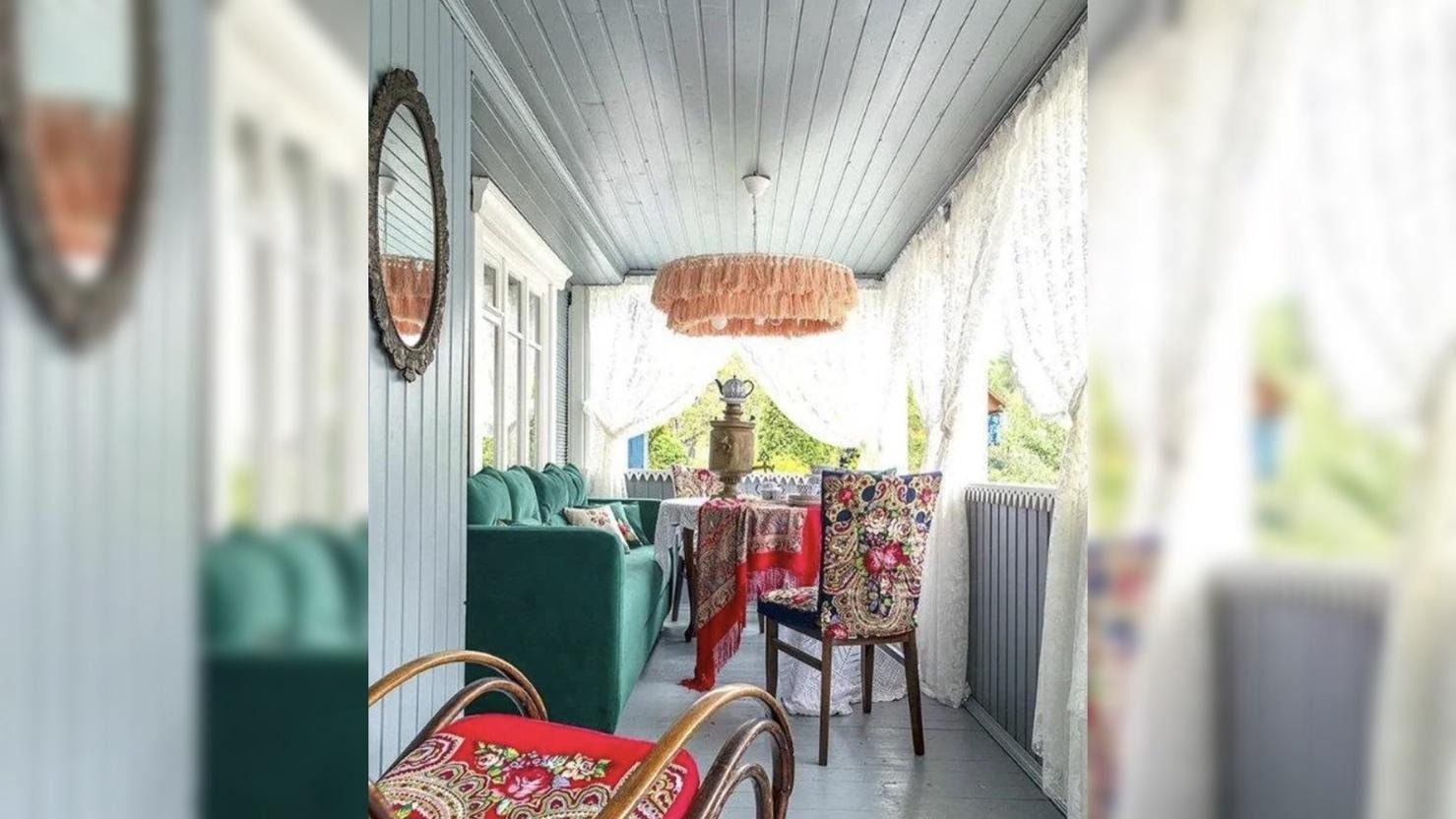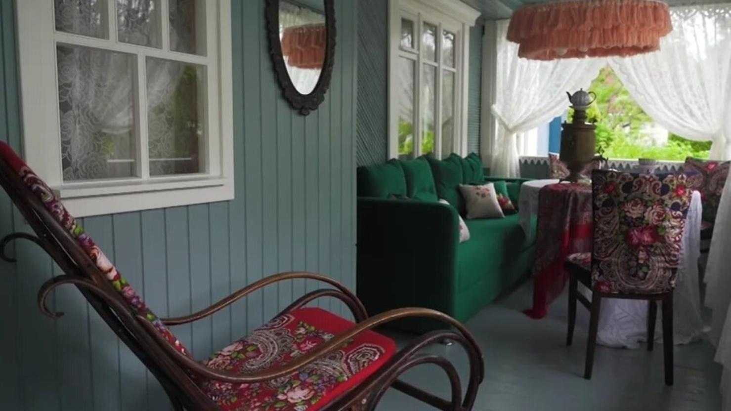 У домика есть терраса с большими окнами. Деревенская аутентичность подчёркивается кружевными белыми занавесками.
