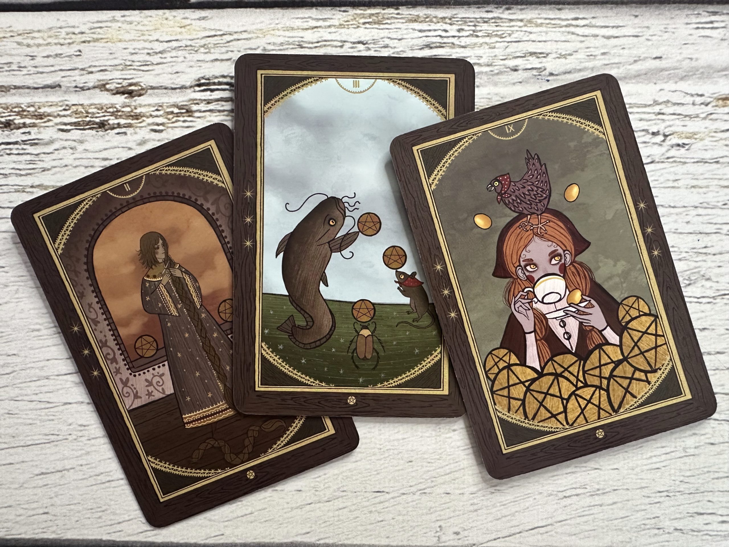 Двойка Пентаклей (в данной колоде — «Василиса Микулишна»), Тройка Пентаклей и Девятка Пентаклей («Курочка Ряба»). Вам постоянно приходится балансировать в денежных вопросах. Этот расклад не то чтобы о бедности, скорее о нестабильности. Даже если денег достаточно, ощущение опоры всё равно не возникает. Что же делать в этом случае? Перестать тащить всё на себе в одиночку. Финансовый рост возможен только через сотрудничество, объединение усилий и работу в команде, утверждает эксперт. Вам нужны союзники или хороший наставник. Если вы сумеете объединить усилия с единомышленниками, то и уровень достатка значительно возрастёт, доход станет стабильным и пропадёт ощущение вечной нехватки денег. Именно так утверждает Девятка Пентаклей — вы сумеете обрести уверенность в завтрашнем дне.