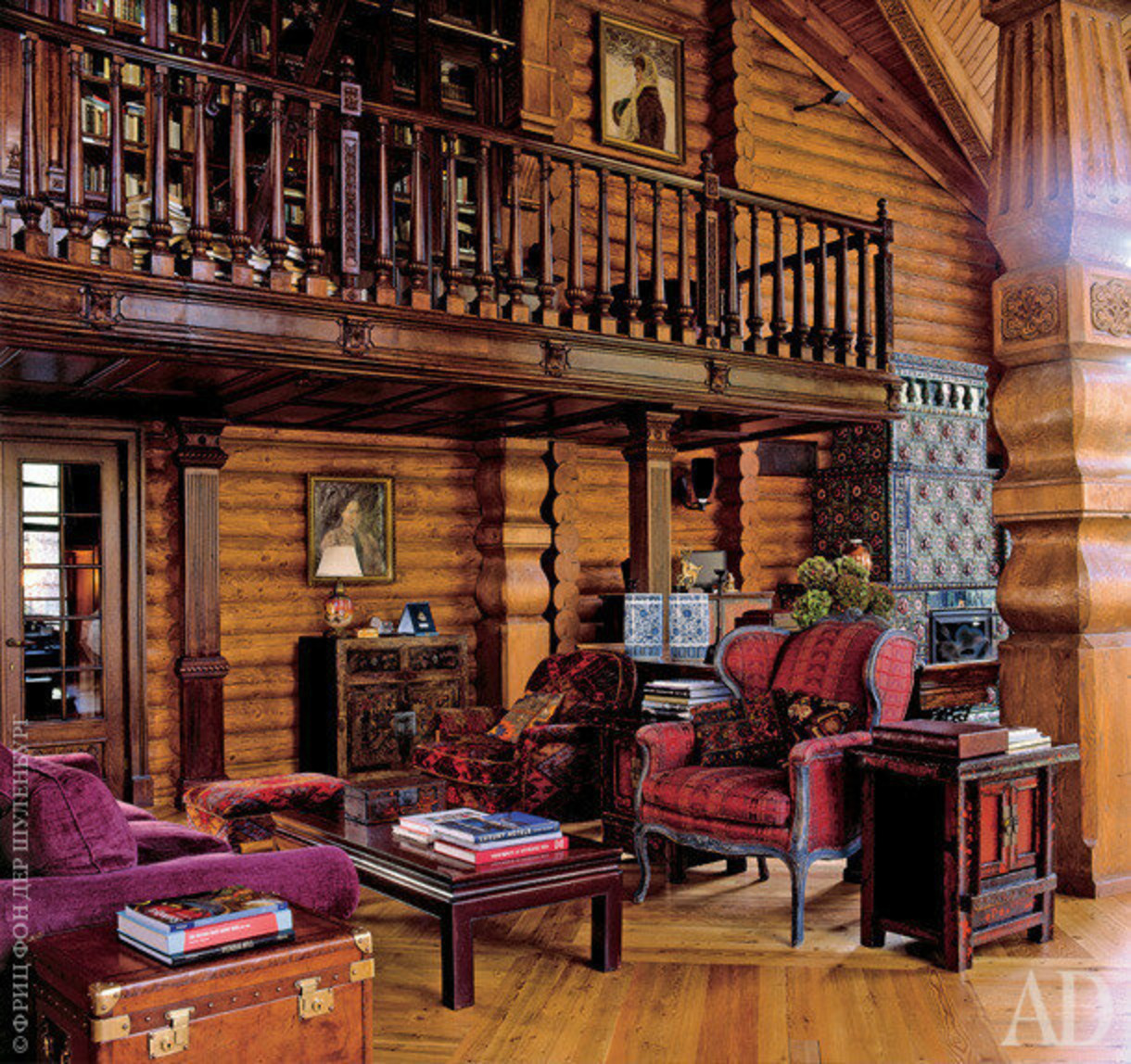 Проект, созданный архитектором Любовью Скориной, объединил традиции и современные технологии. В доме появились зимний сад, просторная кухня, библиотека, спортзал и рабочие кабинеты. Резьба, старинная мебель и семейная коллекция картин соседствуют с климат-контролем и большими окнами.