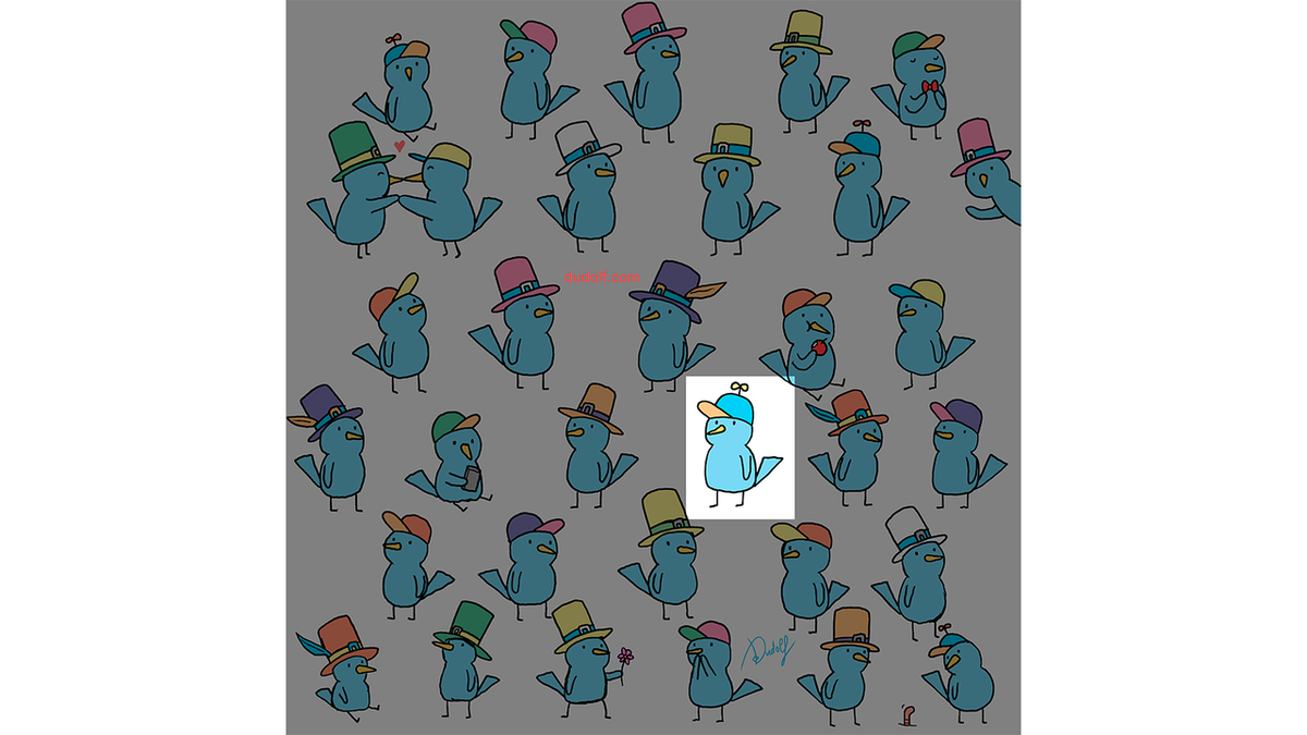 В одной из своих иллюстраций венгерский художник Гергей Дудаш снова предлагает проверить наблюдательность. На картинке — синие птички в разных шляпах. Почти у каждой головной убор повторяется у соседки. Но есть одна деталь, которая выбивается из общего ряда.