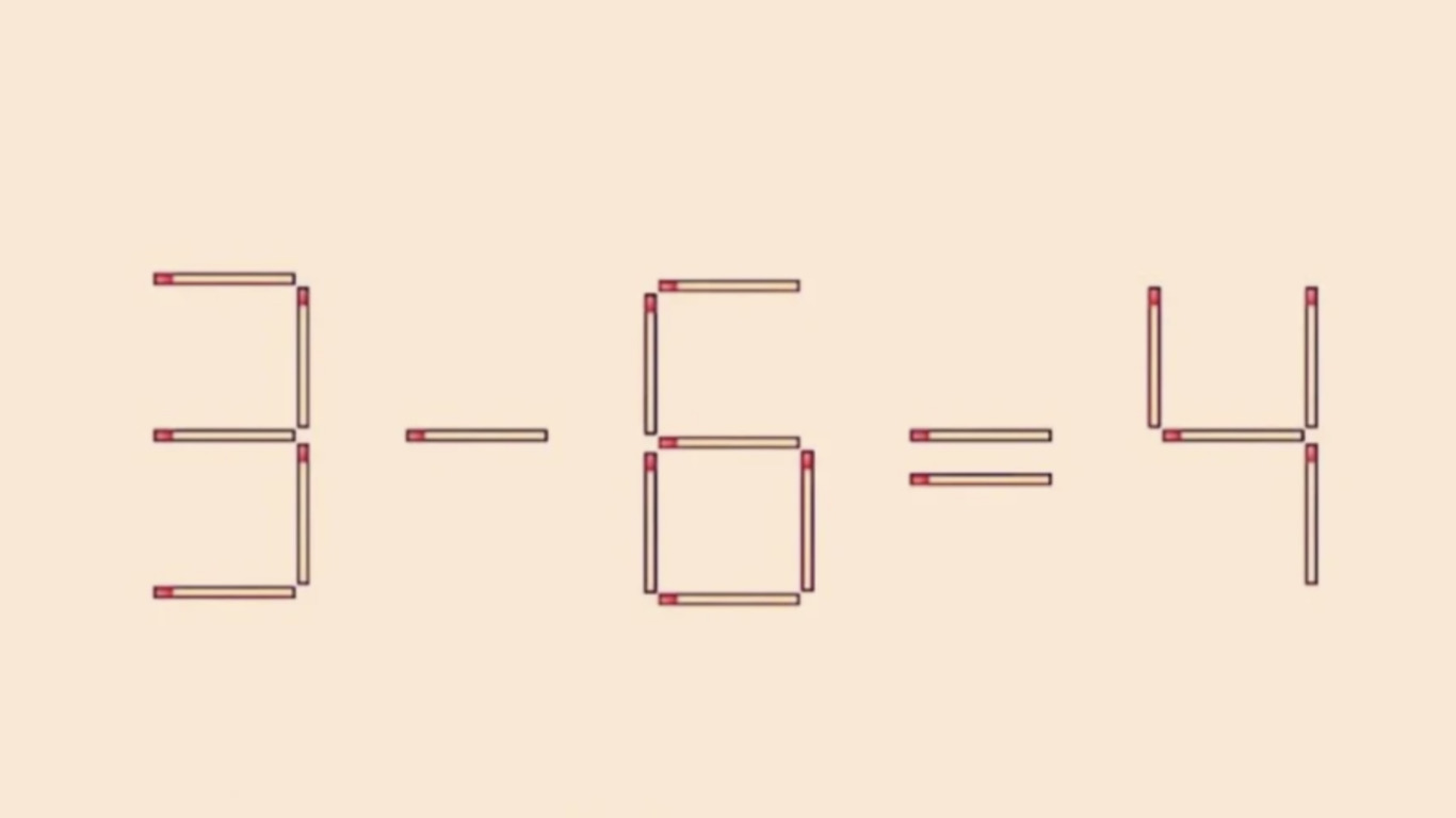 Перед вами задача на внимательность и скорость мышления. На изображении показан пример «3-6=4», в котором допущена ошибка. Нужно изменить равенство, переставив всего одну спичку.