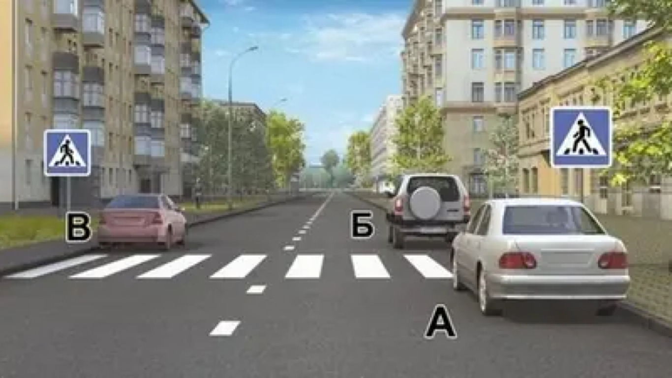 Перед водителями три автомобиля — А, Б и В. Необходимо определить, кто из них нарушил правила остановки.