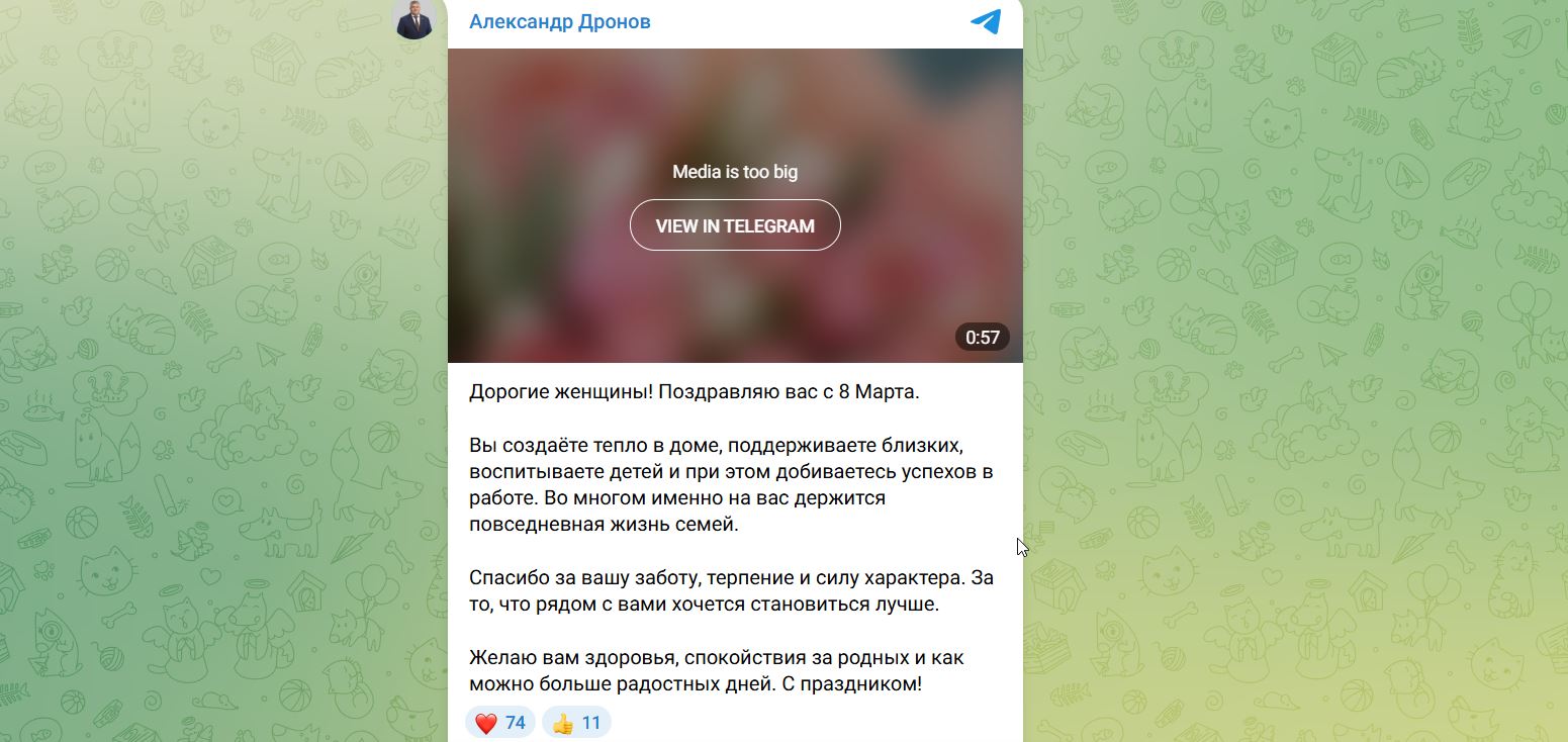 Губернатор Новгородской области Александр Дронов в своём телеграм-канале поздравил женщин с 8 Марта, сгенерировав текст при помощи искусственного интеллекта.