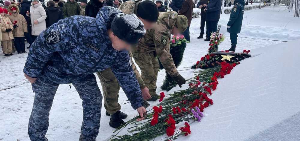 Сотрудники и военнослужащие Управления Росгвардии по Новгородской области почтили память солдат и офицеров минутой молчания, после чего возложили цветы к мемориалу.