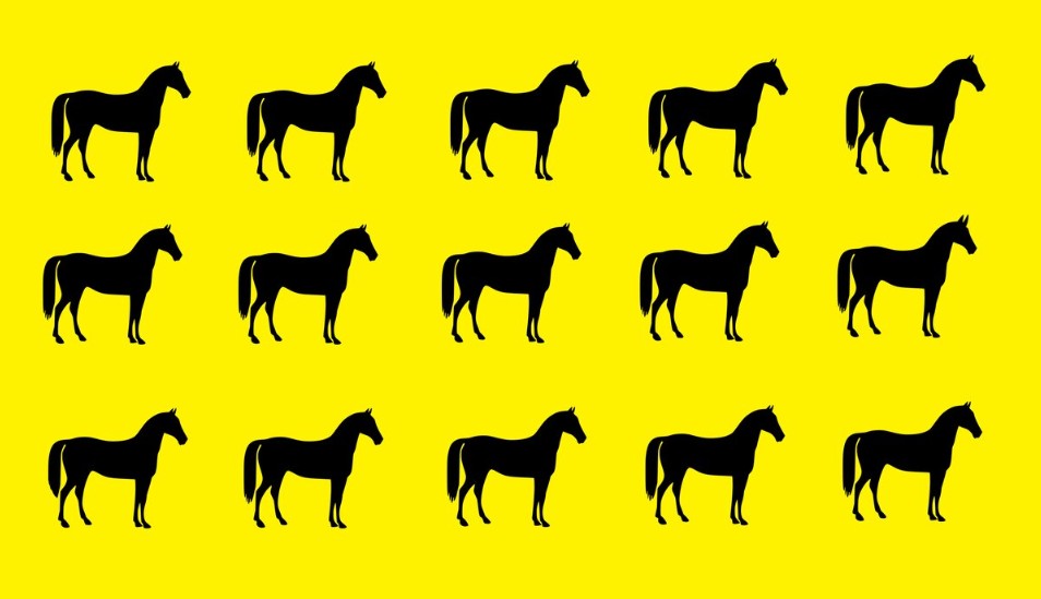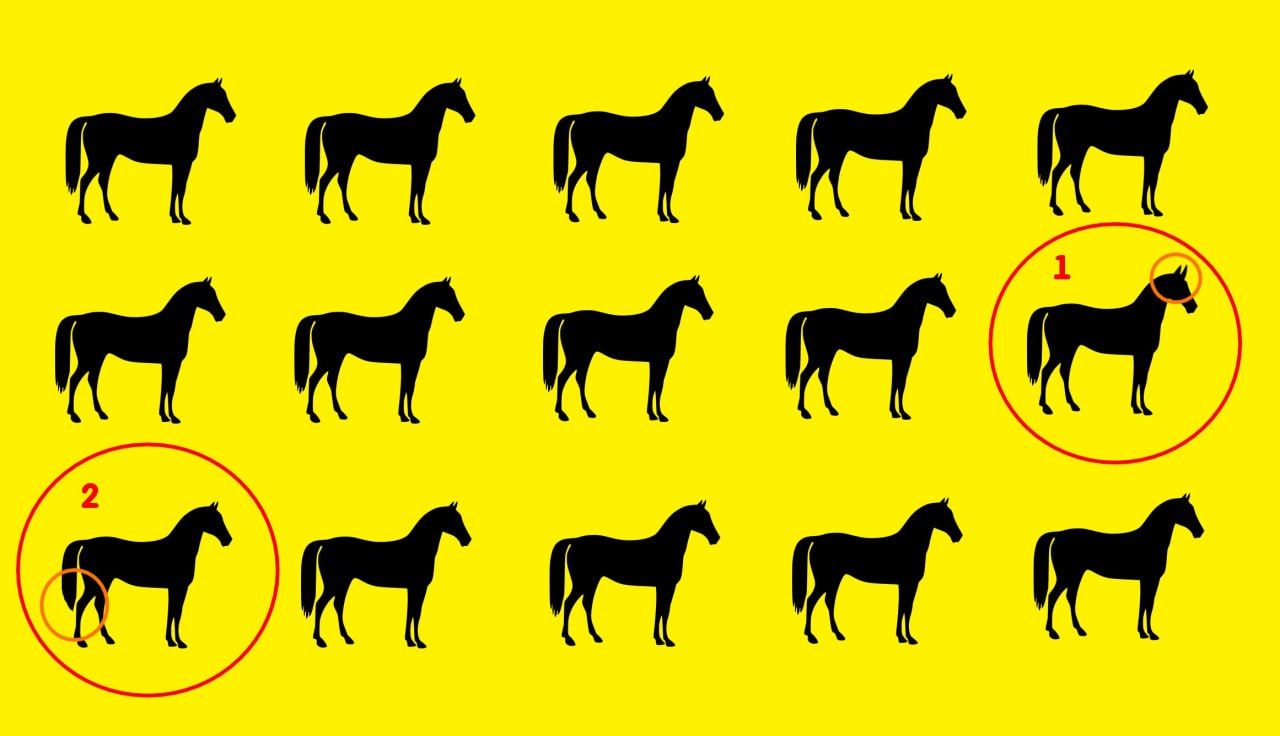 На картинке вы видите абсолютно одинаковых лошадей. Но вот загвоздка: две из них отличаются от остальных. Чем быстрее вы найдете эти две лошади, тем лучше фокусируется ваш мозг. Можете засечь время и устроить соревнование с друзьями или семьёй. Поехали! Ответ приведём ниже.