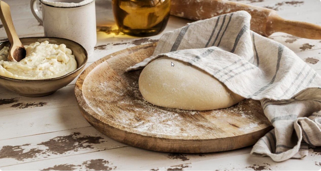 Сухую часть у нас составляет 225 грамм просеянной муки, 15 грамм сахара, несколько грамм разрыхлителя (лучше берите 6) и 3 грамма соли. Соединив эти части, вымешиваем тесто и даём ему отдохнуть 30 минут в комнатной температуре.