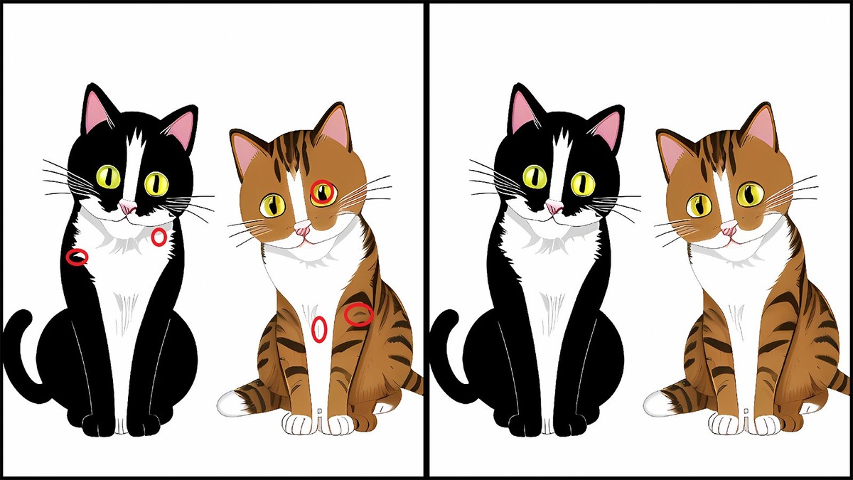 На картинке — два кота. Сидят одинаково, смотрят одинаково, позы совпадают. Всё будто бы один в один. Но на деле изображения не идентичны: между ними пять отличий.