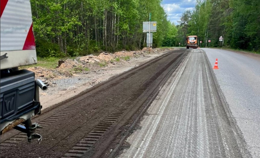 Перед началом ремонта асфальтобетонного покрытия подрядчик восстанавливает земляное полотно на участках дороги с пучинистыми и слабыми грунтами. Также ведутся работы по фрезерованию старого изношенного покрытия.