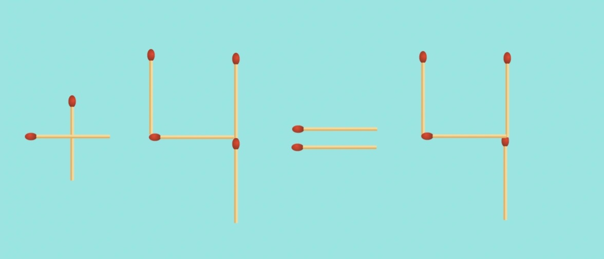 Тот, кто не поленится немного покрутить в голове варианты, заметит: девятка способна превратиться в четвёрку. Останутся две свободные палочки. Их тоже можно пристроить — и здесь как раз появляется то самое недостающее звено: знак плюс. Всё сходится. На выходе — уже не странное «4=9», а вполне осмысленное «+4=4».