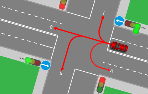 Если вы за рулём обычной легковушки, вам разрешена только траектория А, то есть движение прямо. Поворот, разворот на таком перекрёстке запрещены, несмотря на цвета светофора. У нас остается только траектория B для продолжения движения, которую и примут за ответ на тесте. Надеемся, что подобные билеты помогут вам закрыть некоторые пробелы в собственном понимании дорожно-транспортного движения.