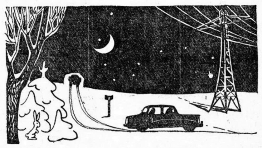 Внимательно рассмотрите черно-белое изображение: тени от ЛЭП и указателя падают в сторону луны. Разве такое возможно? Колея от машин одна, хотя они едут в разные стороны. Где фары у грузовика? Их не должно быть видно. Одно дерево без снега, хотя остальные едва им присыпаны. Звезда на тёмной стороне луны.