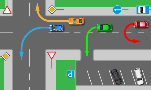 Перед вами едут 4 автомобиля, 3 поворачивают, 1 разворачивается. Кто из них совершает оплошность? Синий и жёлтый автомобили действительно едут правильно, потому как правый поворачивает налево из левого ряда, а второй — направо справа. Вроде как все не режет глаз, однако…