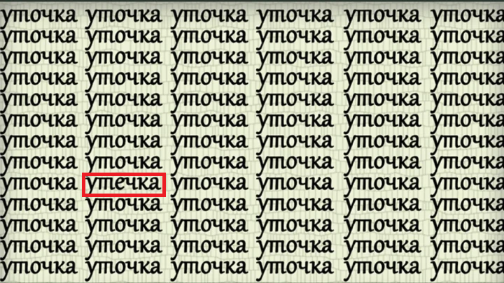 А вот и он. Выделили его для вашего удобства на картинке. Во втором столбце слева, в девятой строке, слово не «уточка», а «утечка». Вот такая интересная головоломка на внимательность и концентрацию.