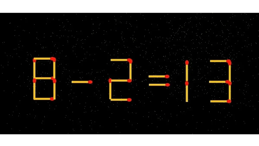 Вот вам одна из таких головоломок: на рисунке показано выражение «8 минус 2 равно 13». Очевидно, что-то не так. Но если мысленно переставить две палочки — не больше и не меньше — всё может измениться. Подсказка: восьмёрка вовсе не обязана оставаться восьмёркой. Немного ловкости, и перед вами уже пятнадцать. А уж 15 минус 2 — это как раз и будет 13.