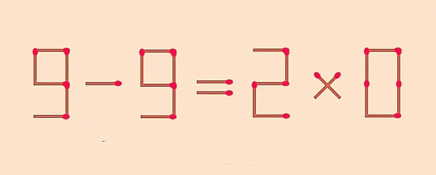 Ну, а теперь — разбор. Если переместить одну спичку с цифры «8» и поставить её к пятёрке, получится «9−9=2×0».