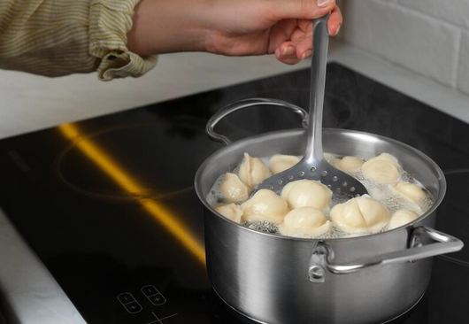 Вместо этого используйте другую технологию: во-первых, вместо кипятка используйте теплую воду, температура которой составляет 50 — 60 градусов, а во-вторых, за 5-7 минут до начала процесса вытащите пельмени из морозильной камеры, чтобы они слегка оттаяли. Это позволит предотвратить тот самый температурный шок, о котором мы писали выше. При этом не надо бросать пельмени в воду, которая еще не закипела — вместо этого лучше добавьте пару стаканов холодной воды непосредственно в кипяток, а уже потом закидывайте туда пельмени.