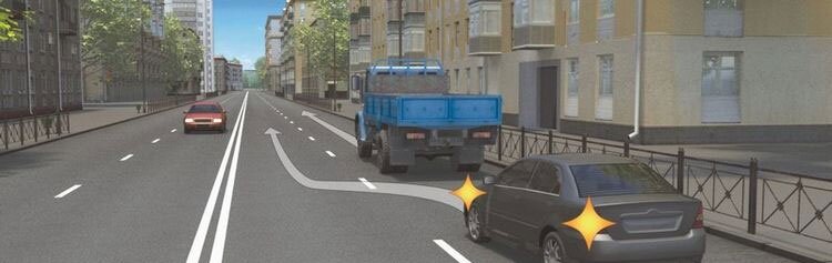 Ну что же, в чём он заключается? Что же он собирается сделать — вопрос открытый: либо объехать, либо обогнать, либо перестроиться с опережением? Эти варианты в равной степени имеют право на жизнь. Правильный ответ, если вы включите интуицию и банально обратитесь к теории, заключён в том, что он хочет перестроиться с дальнейшим опережением.