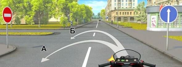 Уже на втором пересечении ограничения снимаются, и теперь можно совершить требующийся нам разворот по траектории «Б». В правилах чётко прописано: знак «Движение прямо», установленный перед перекрёстком, запрещает манёвры только на этом пересечении. Поэтому в графу ответа мы занесём букву «Б».