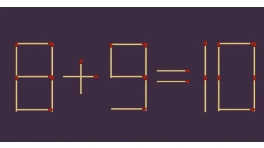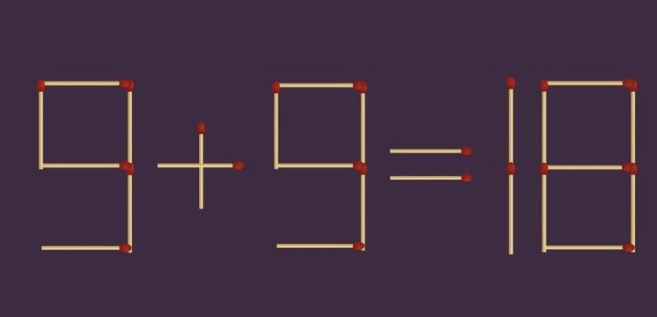 На изображении — равенство: «8+9=10». Понятно, что что-то не так. Но задача как раз в том, чтобы найти решение — без удаления, без добавления новых элементов. Только одна спичка. Если её убрать с первой цифры, восьмёрка превращается в девятку. Тогда и результат надо подправить — не десять, а восемнадцать. В таком виде пример уже не вызывает вопросов: «9+9=18».