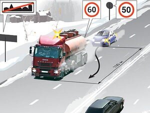 Знак сзади бензовоза указывает на то, что после того, как будет преодолен впереди стоящий знак, машина может увеличить скорость до 60 км/ч. Легковушка сможет передвигаться на максимальной скорости 90 км/ч.