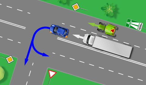 Перед вами схема: синяя легковушка поворачивает налево, грузовик движется прямо по левой полосе, а трактор едет по правой. Имеется знак «Автомагистраль», но важной деталью служит табличка, указывающая, что магистраль начнётся только через 1 километр.