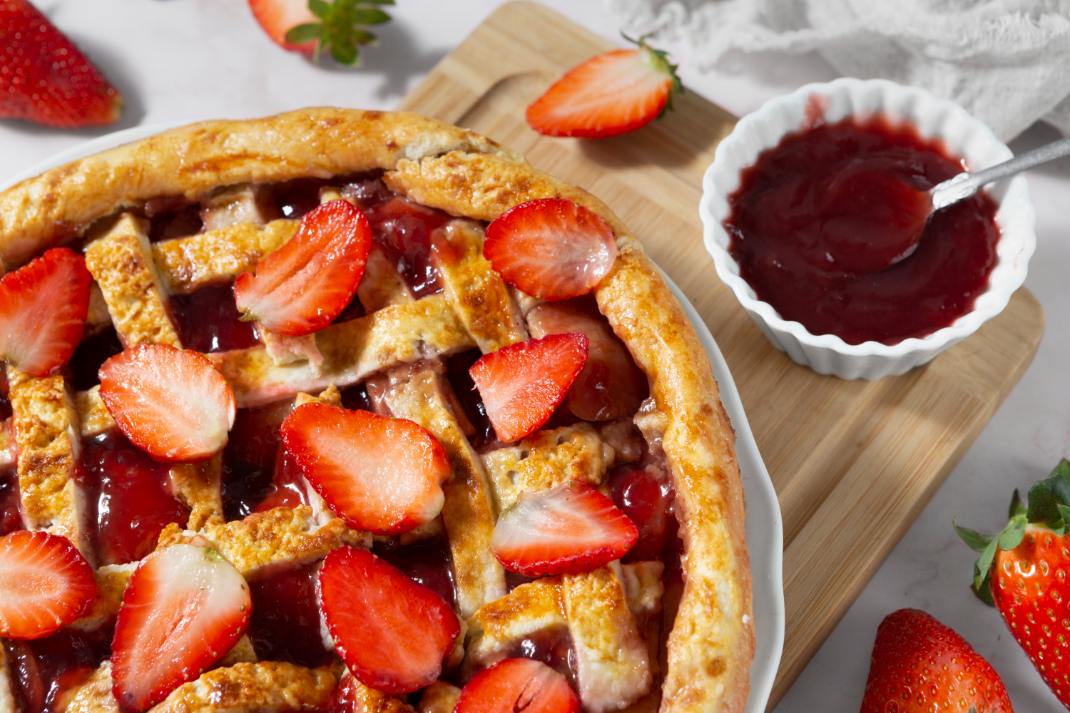 Начинкой будет такая нежная смесь рикотты или творога (на ваше усмотрение) с яйцом, сахарной пудрой и кукурузным крахмалом. Теперь свежая клубника — основной ингредиент этого чуда — добавит пирогу летних ноток и той самой сочности.