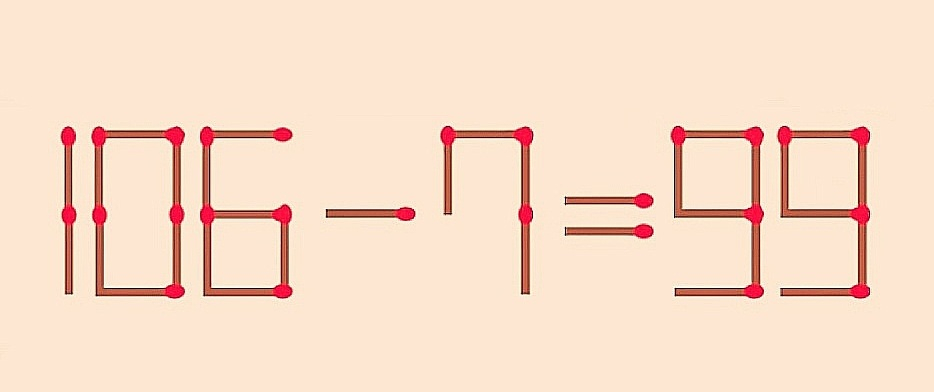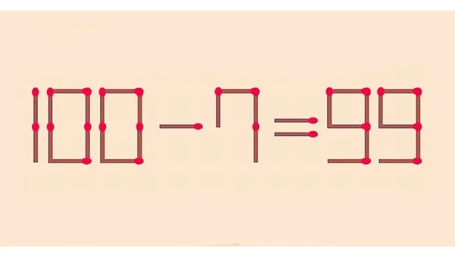 На изображении представлена задача: «100 — 7 = 99». Эта запись содержит ошибку. Необходимо изменить только одну спичку, чтобы выражение стало правильным.