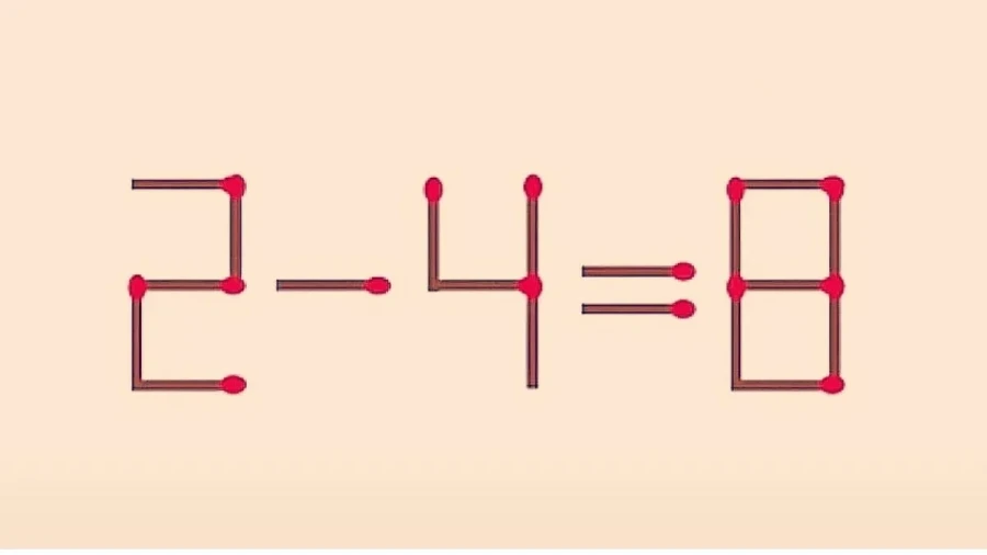 Вот, например, задачка. Изображение с примером: «2-4=8». На вид — неправильно. Там ошибка. Нужно поменять одну спичку. Только одну.