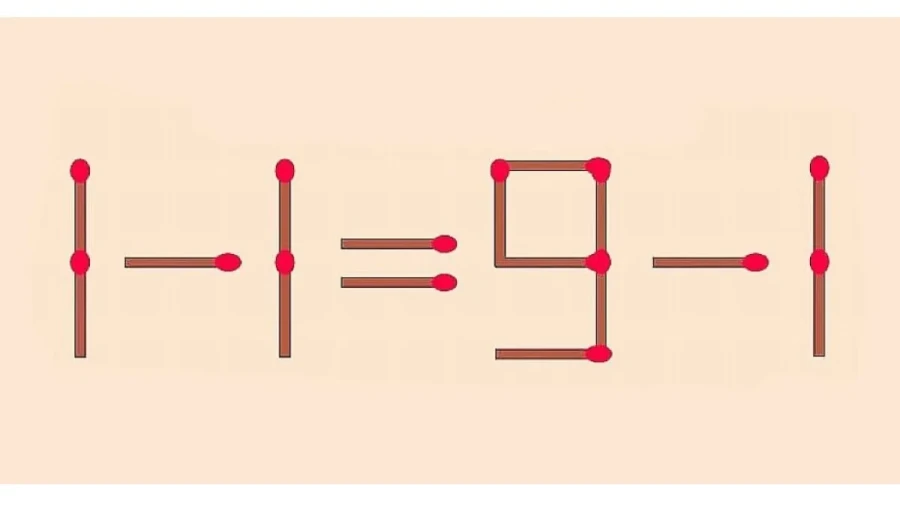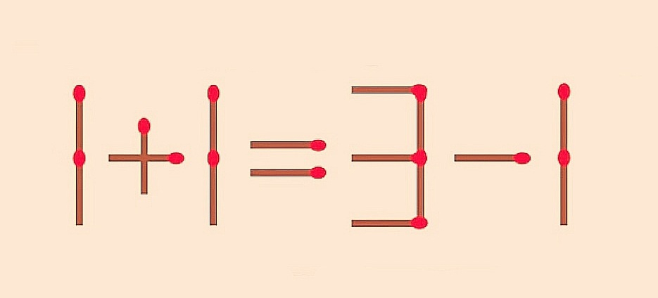 Смотрим. Спичка уходит из «9». Ставится в минус — теперь плюс. Получается «1 + 1 = 3 — 1».