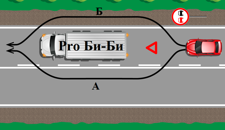 Давайте анализировать и запоминать. Важно, что если машина не движется, то это не обгон, а объезд. Поэтому смело можно использовать прерывистую линию по вашей стороне пути, то есть траекторию «А». А вот объезд по обочине (траектория «Б») сулит вам штраф в 1500 ₽.