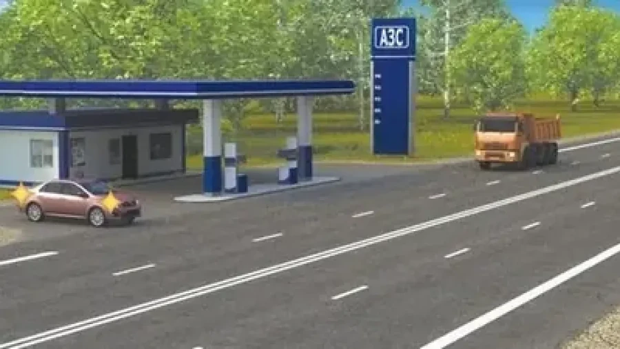 На картинке легковой автомобиль покидает заправочную станцию. По полосе едет грузовик. У кого в этой ситуации преимущество?