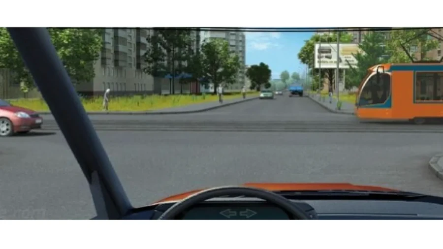 На картинке видно, что вы находитесь на равнозначном перекрестке и хотите проехать прямо. Справа от вас находится трамвай, слева легковой автомобиль. Вопрос: кому из них вы должны уступить дорогу?