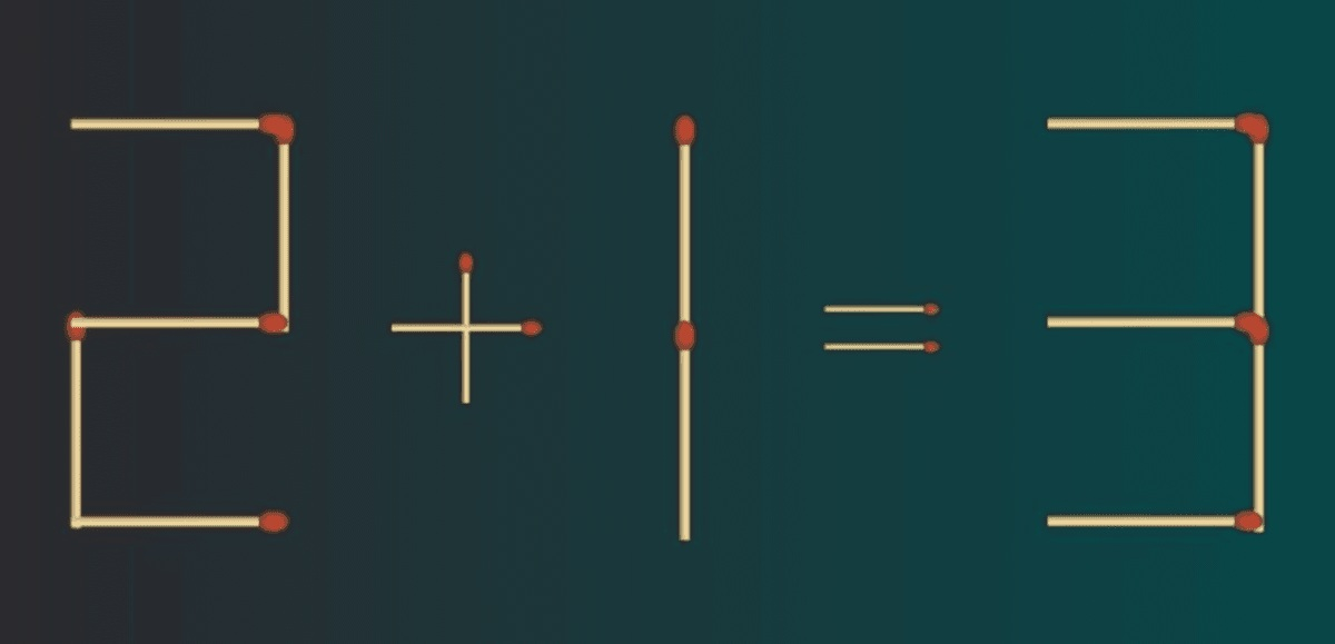Если приглядеться, можно найти выход. Достаточно убрать одну палочку из цифры «9», и она превратится в «3». Одновременно меняем знак «−» на «+». В результате получаем: 2 + 1 = 3.