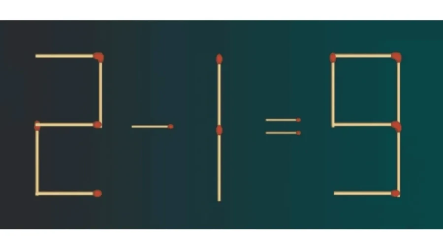На иллюстрации — равенство: 2 − 1 = 9. Очевидно, что оно составлено с ошибкой. Условие простое: разрешается передвинуть одну спичку. Никаких подмен и добавлений — только переместить.