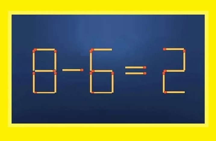 Если взглянуть чуть внимательнее, становится ясно: знак «+» можно превратить в «−». А палочку, которая осталась свободной, использовать, чтобы шестерку превратить в восьмёрку. Так и получается: «8−6=2».