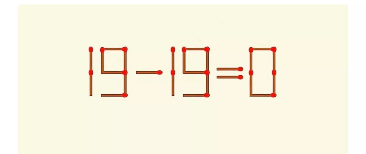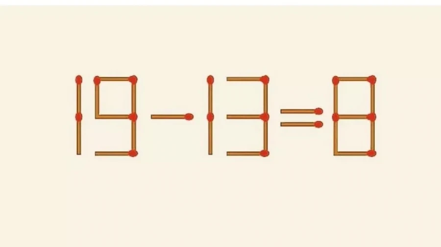 Вот, например, простая задача со спичками. На картинке написано: 19 − 13 = 8. Очевидно, что что-то не так. Ваша задача — исправить это. Двигать можно одну спичку. Только одну. Без добавлений, без удаления.