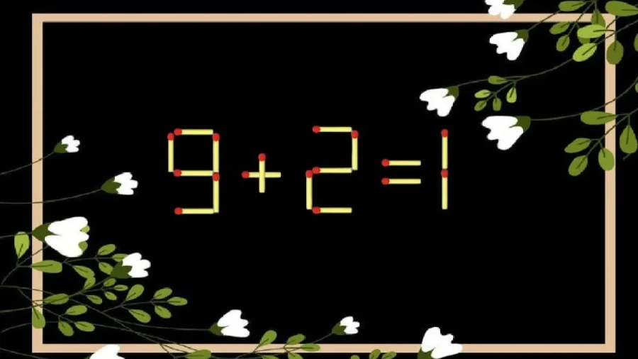 На изображении — выражение: «9+2=1». Понятно, что тут ошибка. Всё, что нужно — найти, как можно передвинуть одну-единственную спичку, чтобы пример стал правильным. Правило простое: никаких замен или добавлений. Только одно действие.