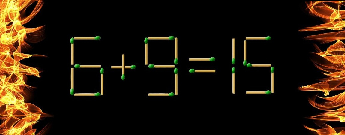 Сверим ход наших действий. Изымаем спичку из цифры 8 так, чтобы она стала цифрой 6. Далее встраиваем спичку в конструкцию цифры 3, теперь она перевоплотилась в цифру 9. После этого наша запись избавилась от ошибки: «6+9=15».